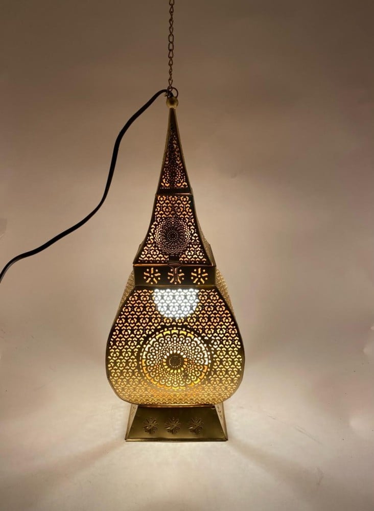 فانوس رقم 1002 باللون ذهبي بطول 46 سم ووزن 830 جم، يقدم تصميماً عملياً وخفيف الوزن، مع ميزة التوصيل المجاني عند شراء ب300 ريال.