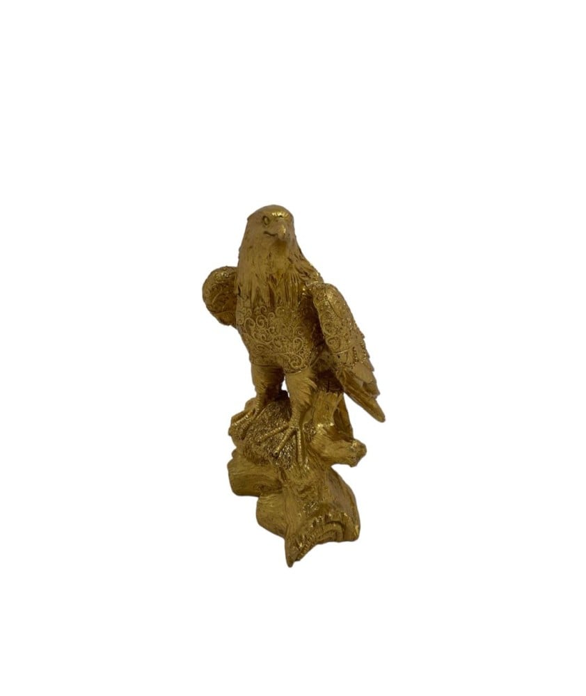 صقر ذهبي مع قاعدة واقف يأتي بطول 21 سم وعرض 10 سم، بوزن 420 جرام، مما يجعله قطعة ديكور أنيقة وثابتة للعرض.